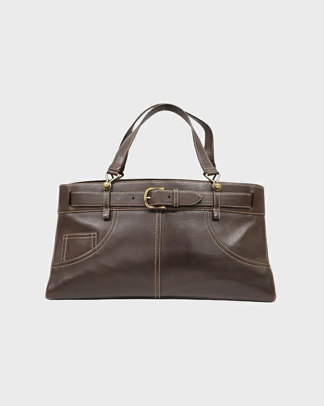 外装 | Aランク:底面やハンドル部分に型崩れ、複数箇所にシワや汚れ、角部分にスレやステッチの毛羽立ち、ハンドルのコバ部分に亀裂や剥がれ、金具部分に黒ずみがございます。 |