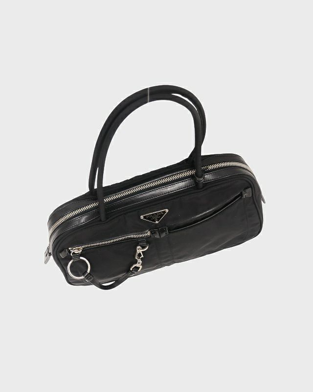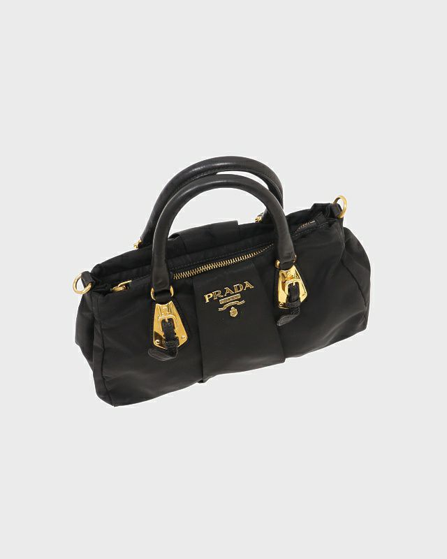 三角ロゴ金具ナイロンレザーミニハンドバッグ